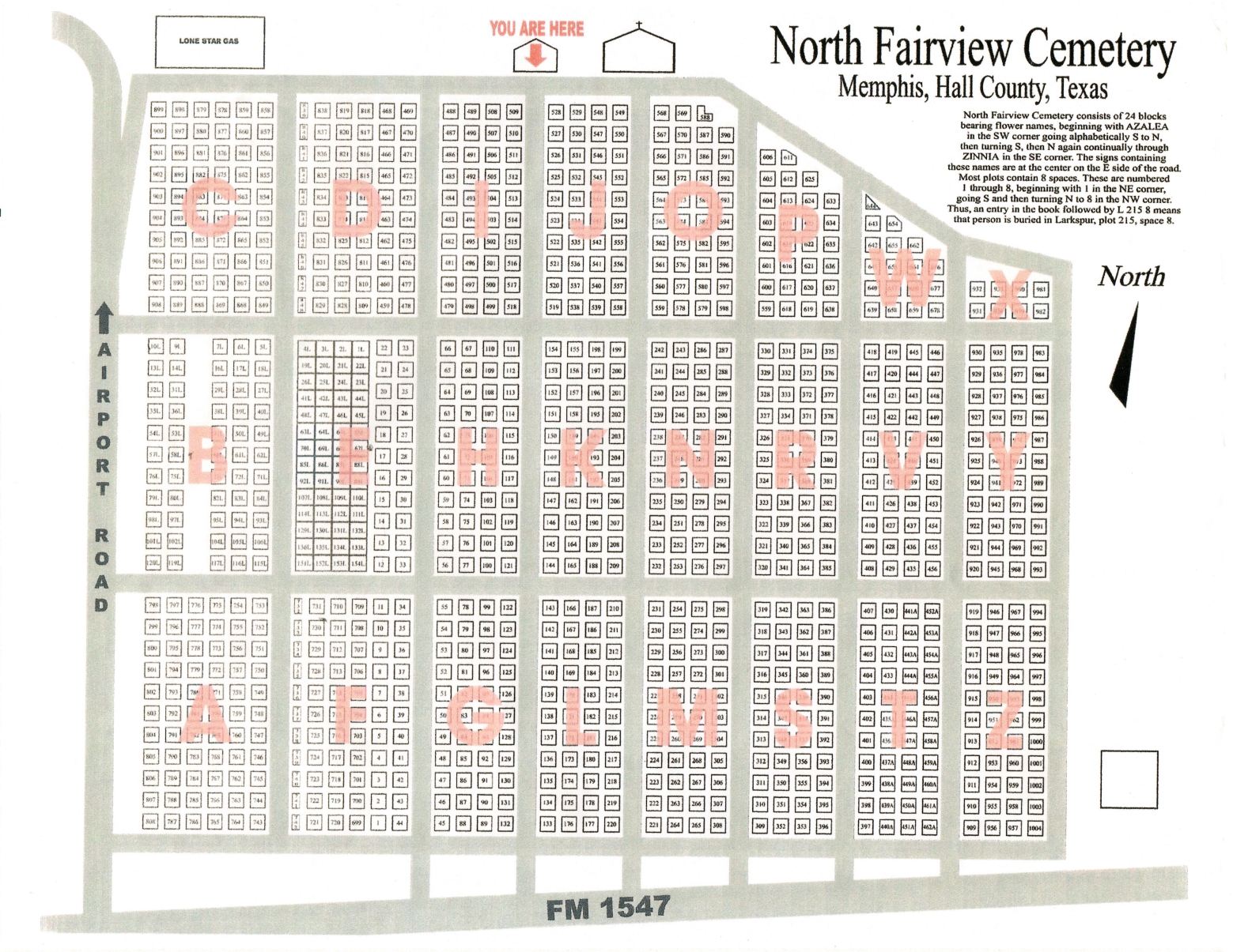 - The North Fairview Cemetery is on the North side of FM 1547. It consists of 24 sections, A - Z, named after flowers.
