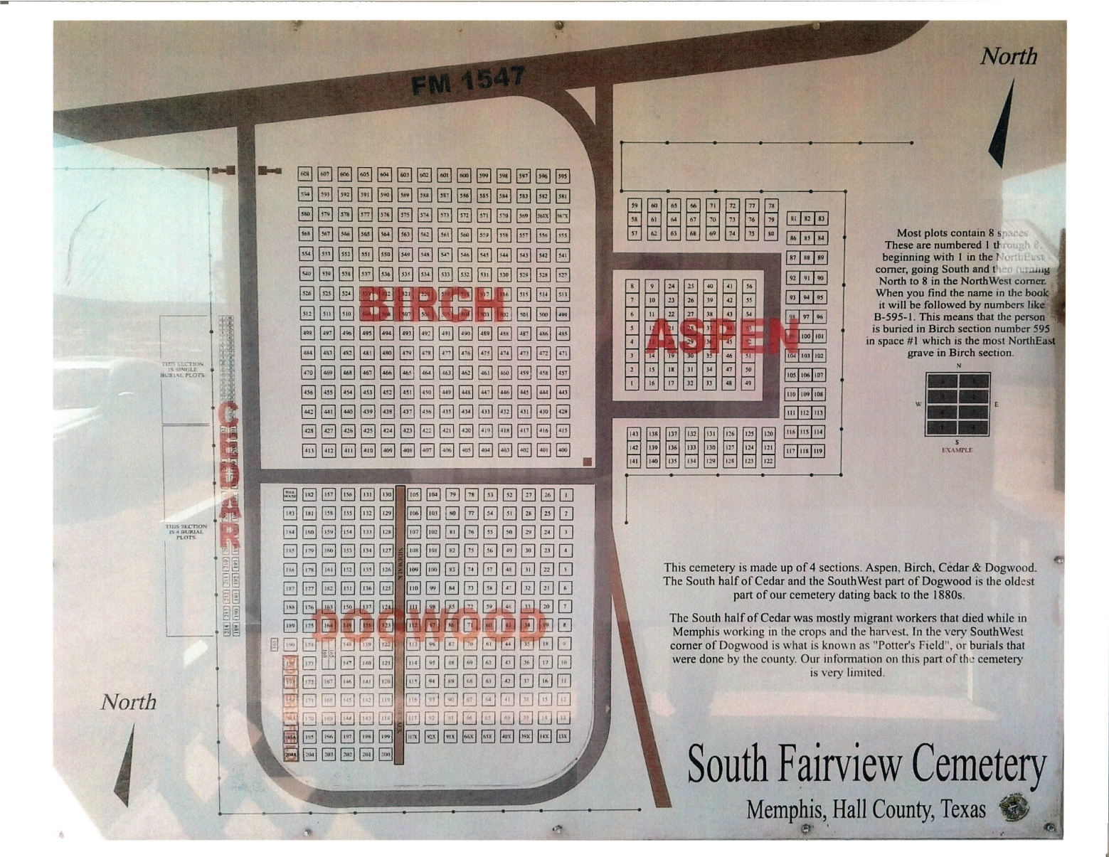 - The South Fairview Cemetery is on the South side of FM 1547. It consists of 4 sections - Birch, Dogwood, Aspen, and Cedar. The Southwest section of Dogwood also consists of Potters Field (Indigent section).